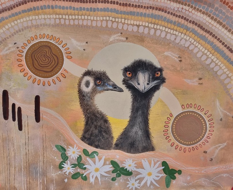 Beneath the emus, the silver daisy bush blooms – a totem of resilience known for thriving in tough conditions. It symbolizes endurance, hope, and growth despite challenges.